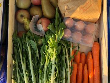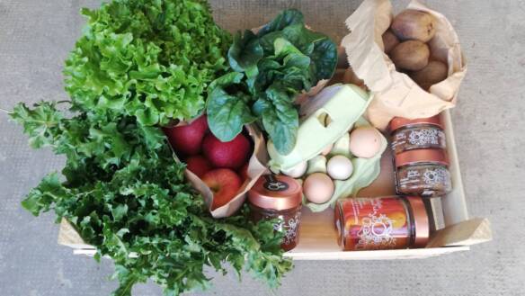 La cassetta comprende prevalentemente ortaggi e frutta da terra di produzione propria, con altra frutta e uova da contadini fidati; tutto rigorosamente biologico, di stagione e locale. Poi ci sono anche fiori edibili, erbe spontanee, verdure tagliate e preparate, trasformati come dado vegetale e passata di pomodori gialli – tutto proprio.