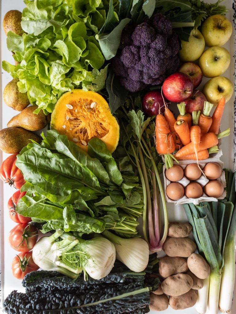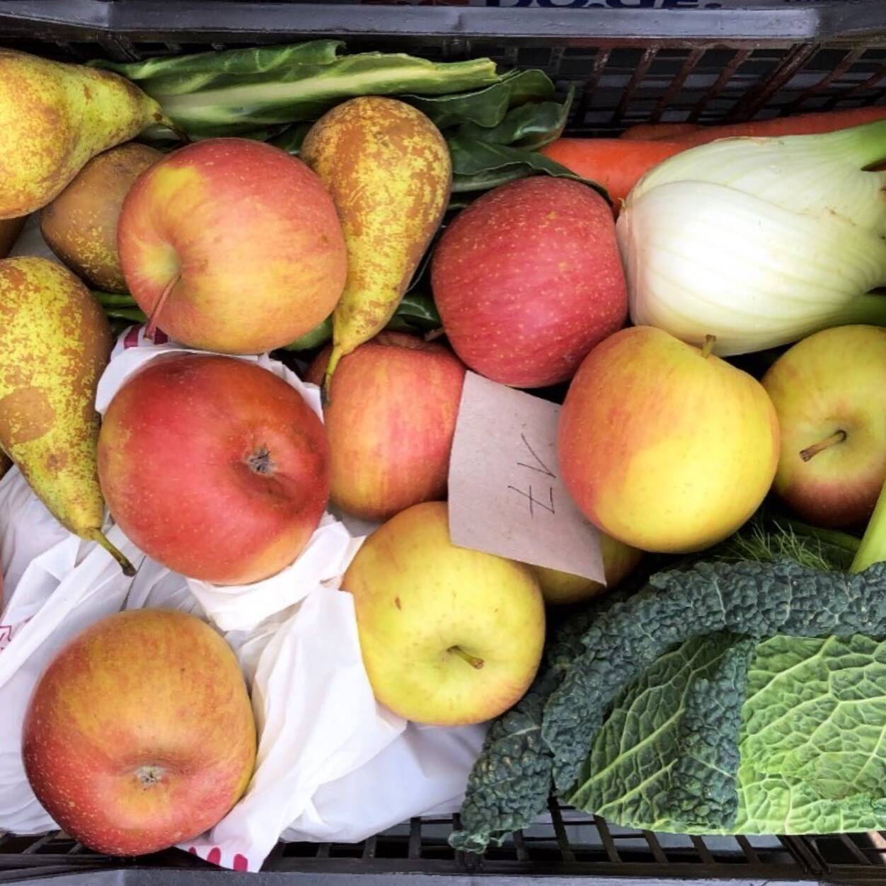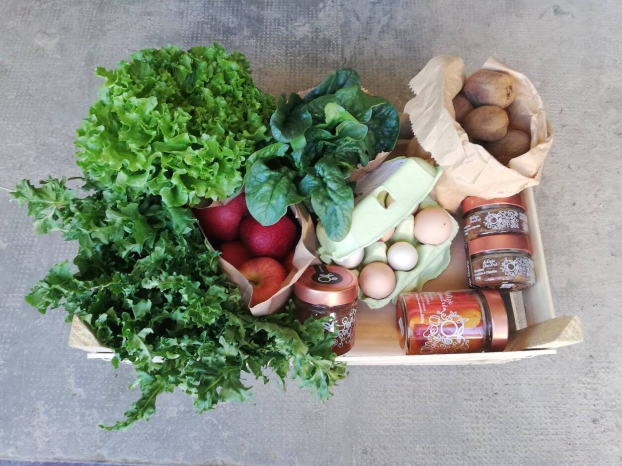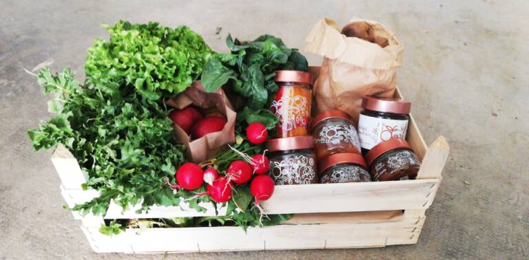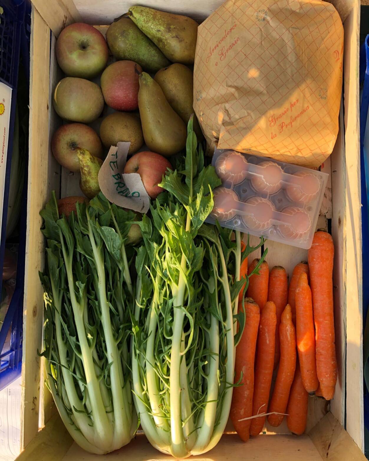 La cassetta comprende prevalentemente ortaggi e frutta da terra di produzione propria, con altra frutta e uova da contadini fidati; tutto rigorosamente biologico, di stagione e locale. Poi ci sono anche fiori edibili, erbe spontanee, verdure tagliate e preparate, trasformati come dado vegetale e passata di pomodori gialli – tutto proprio.